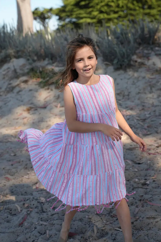 Vestidos y faldas de algodón turco para niña, ligeros y resistentes a la arena, confeccionados en las Carolinas. Son cómodos para la playa y elegantes para el día a día . Diseñados para transpirar , son fáciles de empacar y se pueden llevar con ella desde días de sol, surf y piscina hasta cenas y fotos.