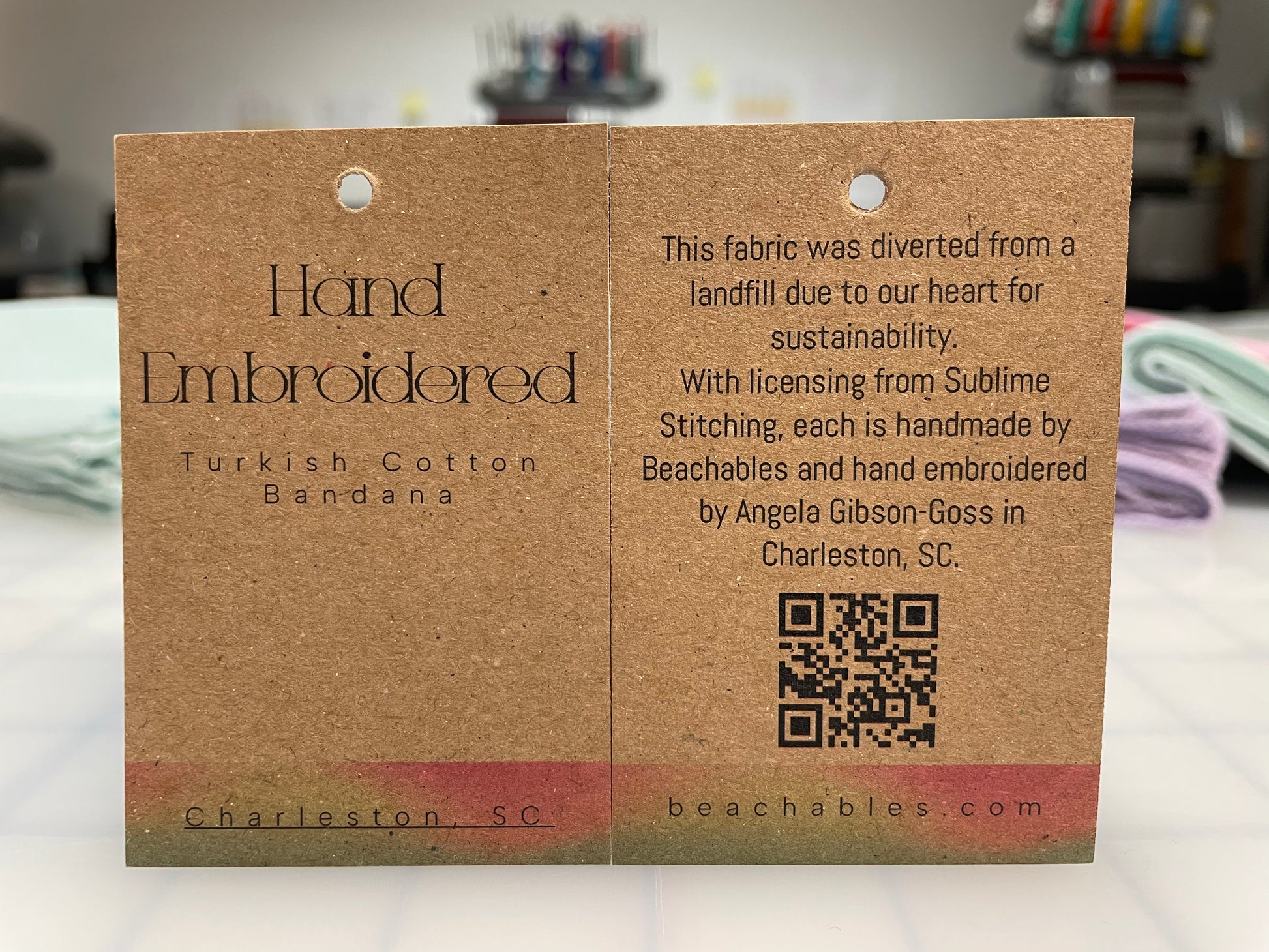 Features: Each bandana is embroidered by hand by our talented employee, Angela Gibson-Goss, in Charleston, SC, and made in limited batches under our exclusive licensing with Sublime Stitching (only 100 pieces per year!).